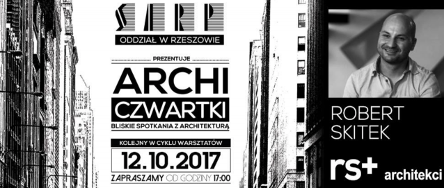 W imieniu SARP oddział w Rzeszowie, w ramach bliskich spotkań z Architekturą „ARCHI – CZWARTKI”, zapraszamy serdecznie 12 października o godz. 17.00 do Ratusza w Rzeszowie na którym o swojej pracy, życiu, pasjach i projektach opowie nam architekt ROBERT SKITEK