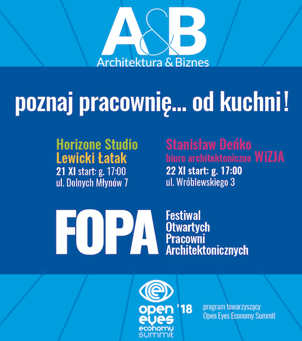 Festiwal Otwartych Pracowni Architektonicznych, który odbędzie się w dniach 21-22 listopada, to unikalne wydarzenie towarzyszące kongresowi Open Eyes Economy Summit w Krakowie, który odwiedza 2500 osób. Kongres jest zainicjowany przez prof. Jerzego Hausnera i skierowany do wszystkich zainteresowanych nowym ideami i nowym modelem ekonomicznym, który może stać się receptą na wszelkie kryzysy, w tym te, które dotyczą przestrzeni architektoniczno-urbanistycznej miasta. Skupia znanych polityków i społecznych aktywistów, naukowców i studentów, dziennikarzy i artystów.