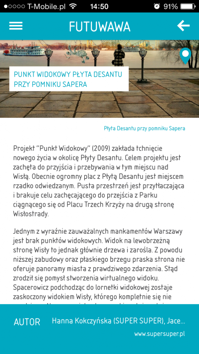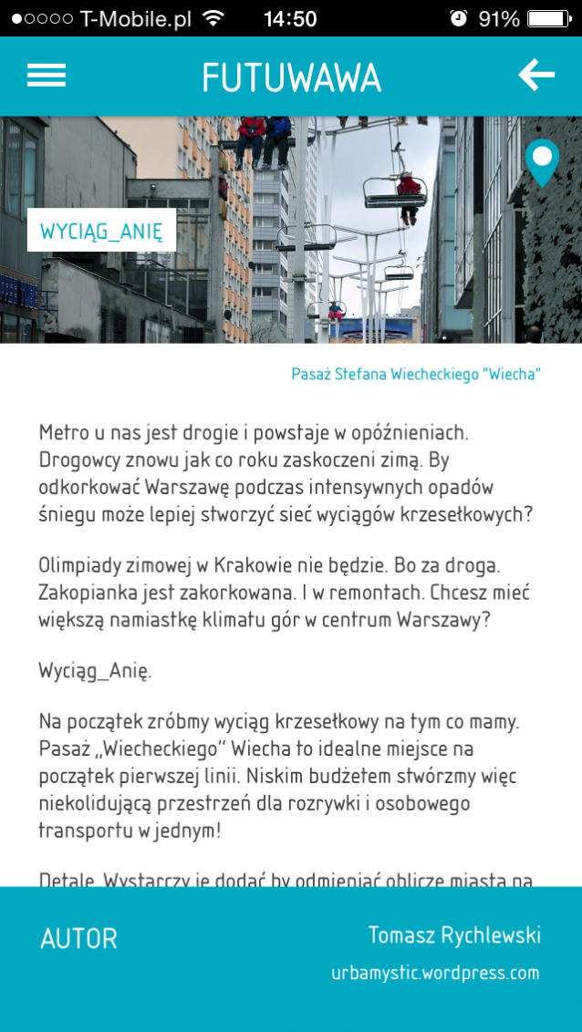 Polsko-angielska aplikacja mobilna FUTUWAWA służy do zwiedzania Warszawy szlakiem wyobrażonych placów, budynków, bulwarów, mostów, ulic, instalacji czy mebli miejskich zaprojektowanych przez architektów i artystów, studentów i wszystkich tych, którzy dzielą się swoimi pomysłami na Warszawę. Jest to miasto utopijne, futurystyczne, niczym nieograniczone, które czeka na odkrycie.