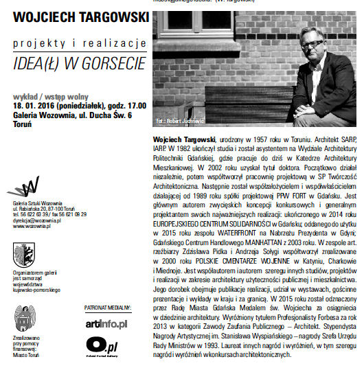 Galeria Sztuki „Wozownia” w Toruniu zaprasza na kolejny wykład w ramach projektu „architektura w wozowni” /autorka projektu: Teresa Dudzińska - 18 stycznia (poniedziałek) 2016 roku, godz. 17, Toruń, ul. Ducha Św. 6 , wstęp wolny
