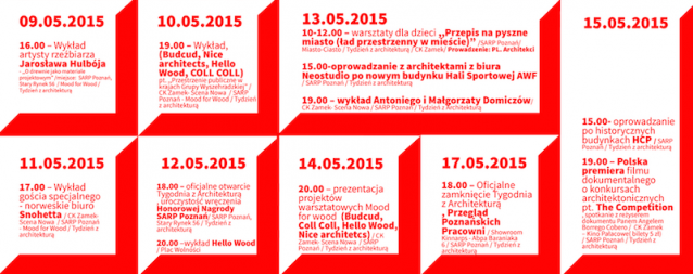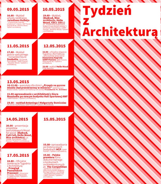 SARP Poznań informuje o zbliżającym się Tygodniu z Architekturą organizowanym przez Stowarzyszenie Architektów Polskich Oddział w Poznaniu w dniach 9-17 Maja 2015 r. W ramach Tygodnia z Architekturą odbędzie się wiele ciekawych spotkań, wykładów, spacerów tematycznych oraz warsztaty.