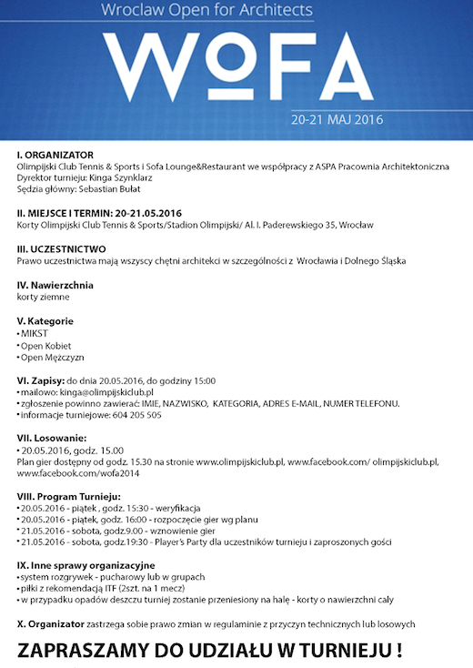 W imieniu Organizatorów zapraszamy na III edycję turnieju tenisowego WOFA Wroclaw Open For Architects dedykowanego środowisku architektów, który odbędzie się w dniach 20-21 maja 2016 r. na kortach Stadionu Olimpijskiego we Wrocławiu. Wszystkie szczegóły dotyczące wydarzenia znajdują się w załączonych materiałach informacyjnych.