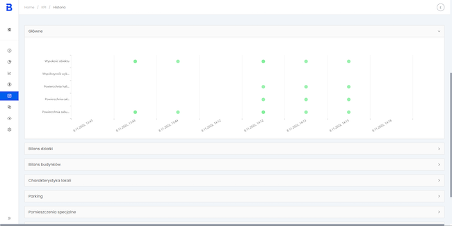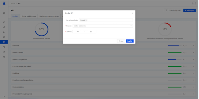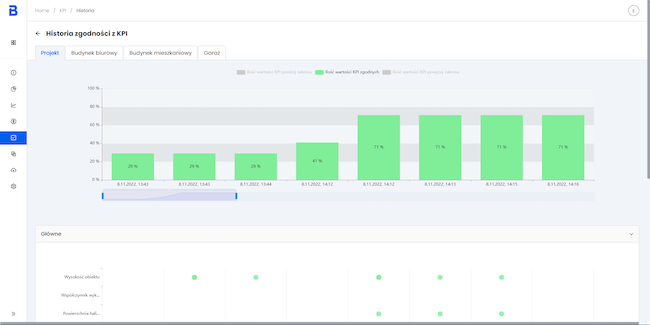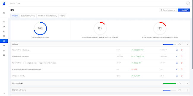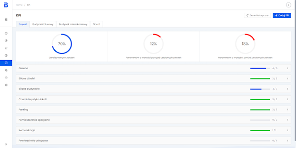 Następnie bieżące wartości kluczowych parametrów projektu zostają zestawione ze zdefiniowanymi wcześniej przez użytkownika wymaganiami. Platforma automatycznie wizualizuje informacje o procencie zrealizowanych założeń inwestycyjnych zarówno w skali całego projektu, jak i poszczególnych grup parametrowych. Rozróżnienie kolorystyczne pomiędzy wymaganiami spełnionymi i niezrealizowanymi, ułatwia identyfikację wymagań, które muszą zostać dopracowane.