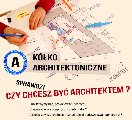 Hasło przewodnie naszych zajęć to: SPRAWDŹ, CZY CHCESZ BYĆ ARCHITEKTEM? Warsztaty skierowane są do wszystkich, którzy chcą sprawdzić w praktyce, jak wygląda praca i świat architekta. Dzięki wspólnej pracy i zabawie będziecie mogli odkryć swoje umiejętności i zdolności w zakresie architektury oraz innych dziedzin jej pokrewnych. Jeśli masz 13-17 lat i lubisz wymyślać, projektować, tworzyć, te warsztaty są dla Ciebie! Przekonaj się sam, czy architektura gra w twojej duszy. Zapisz się do Kółka Architektonicznego! :)