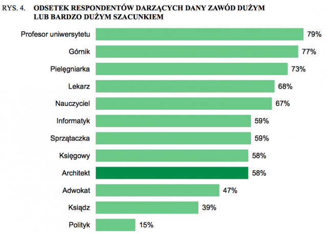 Pod koniec grudnia 2014 roku Centrum Badań Opinii Społecznej opublikowało raport dotyczący opinii Polaków na temat architektów, ich pracy oraz wpływu na wygląd miast, a także zadowolenia z wyglądu polskich miast. Badanie przeprowadzono metodą wywiadów bezpośrednich (face-to-face) w dniach 11–17 września 2014 roku na liczącej 946 osób reprezentatywnej próbie losowej dorosłych mieszkańców Polski. To pierwsze tego typu badanie przeprowadzone na tak dużą skalę.