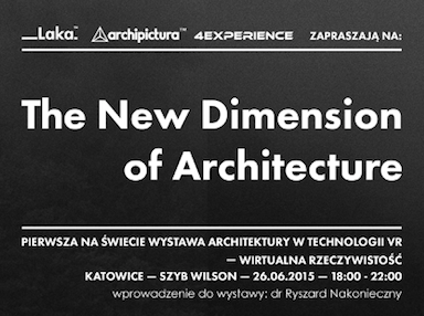 W ramach współpracy z partnerami strategicznymi 4Experience i Archipictura™. 26 czerwca w galerii Szyb Wilson w Katowicach będzie mieć miejsce wyjątkowa wystawa The New Dimension of Architecture z wykorzystaniem wirtualnej rzeczywistości w technologii Samsung VR Gear®. Będzie to pierwsza tego typu wystawa na świecie. Ekspozycja połączona z panelami dyskusyjnymi oraz wykładami znanych architektów, ma na celu promocję architektury reaktywnej w regionie, jak również wdrażanie nowych technologii w kontekście architektury.