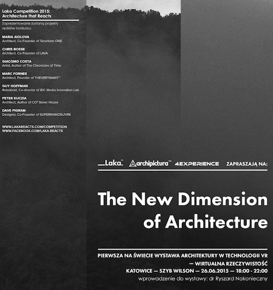 Wystawa związana jest z konkursem Laka Competition'15 "Architecture that Reacts". W jury konkursowym zasiądą: Piotr Kuczia, Maria Aiolova, Giacomo Costa, Guy Hoffman, Dave Pigram, Chris Bosse i Marc Fornes. Więcej informacji o konkursie mogą Państwo znaleźć na stronie: www.lakareacts.com/competition . Program wydarzenia w załączniku.