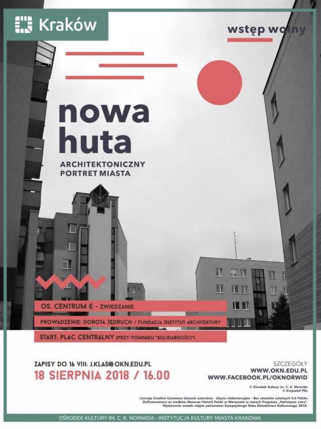 Nowa Huta – architektoniczny portret miasta – cykl działań animacyjno-edukacyjnych w postaci spacerów, zwiedzania lub prelekcji portretujących architektoniczne dziedzictwo kulturowe Nowej Huty z drugiej połowy XX w. W ramach przedsięwzięcia wydana zostanie recenzowana publikacja oraz zaprojektowane będą tzw. ikony miejskie, czyli schematyczne rysunki-piktogramy przedstawiające najważniejsze obiekty na bazie których powstanie seria gadżetów promujących lokalne dziedzictwo kulturowe.
