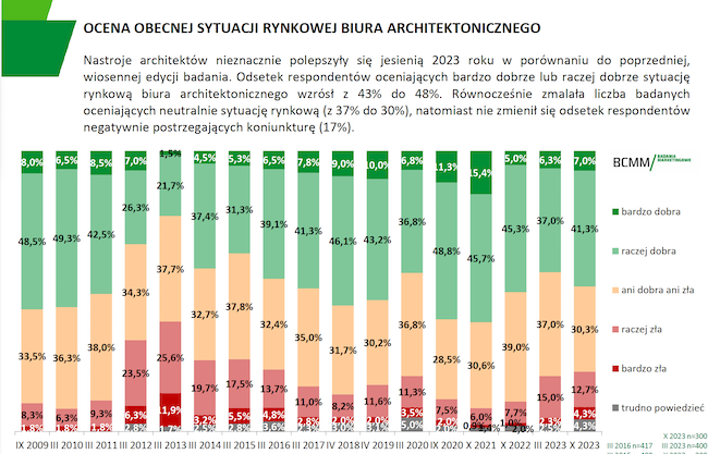Instytut BCMM – badania marketingowe, w ramach cyklicznego projektu badawczego branży budowlanej OMNIBUD, po raz kolejny zapytał architektów o ocenę sytuacji rynkowej ich biura architektonicznego pod kątem realizacji i pozyskania zleceń. Z najnowszego raportu BCMM wynika, że nastroje architektów nieznacznie polepszyły się jesienią 2023 roku w porównaniu do poprzedniej, wiosennej edycji badania. Odsetek respondentów oceniających bardzo dobrze lub raczej dobrze sytuację rynkową biura architektonicznego wzrósł z 43% do 48%. Równocześnie zmalała liczba badanych oceniających neutralnie sytuację rynkową (z 37% do 30%), natomiast nie zmienił się odsetek respondentów negatywnie postrzegających koniunkturę (17%).