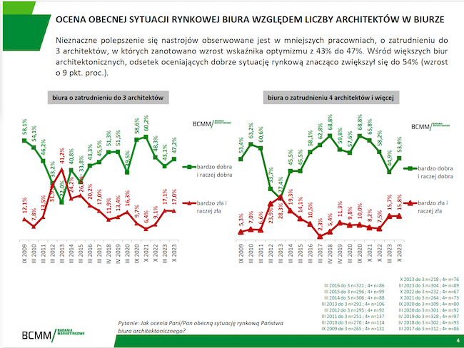 Nieznaczne polepszenie się nastrojów obserwowane jest w mniejszych pracowniach, o zatrudnieniu do 3 architektów, w których zanotowano wzrost wskaźnika optymizmu z 43% do 47%.