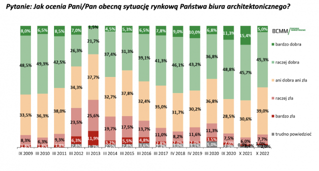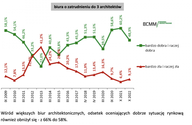 Wśród większych biur architektonicznych, odsetek oceniających dobrze sytuację rynkową również obniżył się - z 66% do 58%. Szczegóły zobacz w załączonych grafikach.