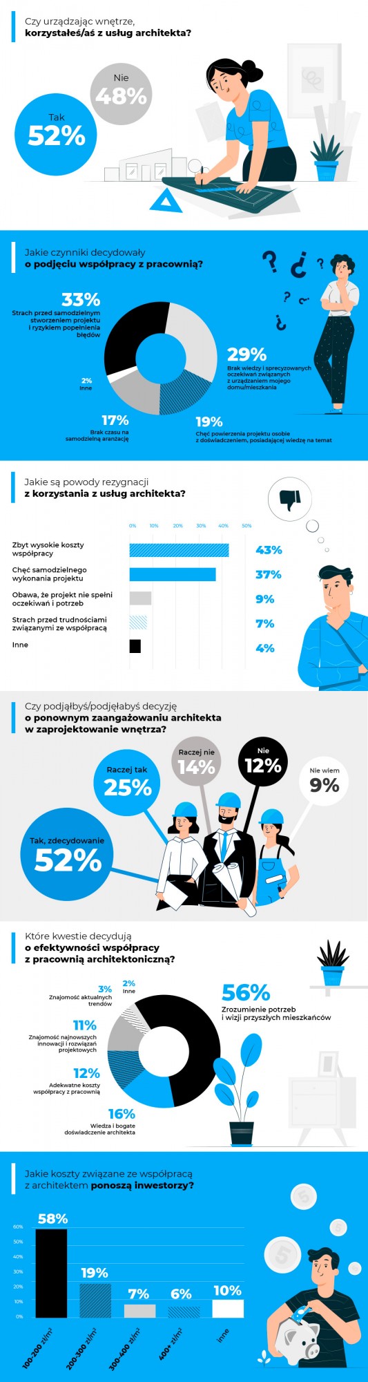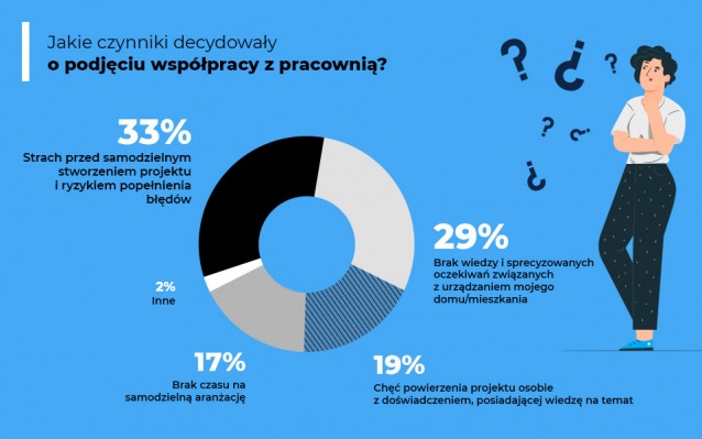 Okazuje się, że najczęstszym powodem skłaniającym osoby urządzające swoje wnętrza do skorzystania z wiedzy i umiejętności pracowni, jest strach przed samodzielną pracą nad projektem i związane z tym ryzyko popełnienia błędów. Tę obawę zadeklarowała ponad 1/3 ankietowanych. Kwestią wymienianą w drugiej kolejności był brak wiedzy oraz określonych planów i wymagań związanych z wykorzystaniem konkretnych rozwiązań projektowych (29% badanych). Użytkownicy motywowali współpracę z architektką lub architektem również potrzebą zaufania umiejętnościom profesjonalistów w dziedzinie projektowania. Ostatnim czynnikiem wskazywanym przez uczestników badania był brak czasu na samodzielne urządzanie wnętrza (17% osób).