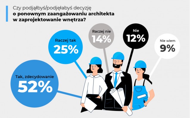 Respondenci, którzy w przeszłości korzystali z usług pracowni projektowej, najczęściej podjęliby decyzję o ponownym nawiązaniu takiej współpracy (65%), przeciwnego zdania było 26% ankietowanych, a 9% z nich nie potrafiło wskazać jednoznacznej odpowiedzi.