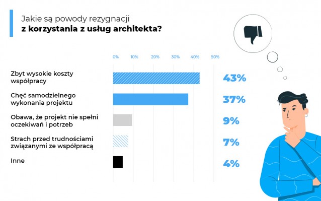 Grupa użytkowników, która swoje wnętrza aranżowała bez zaangażowania pracowni projektowej, jako powód rezygnacji ze współpracy, najczęściej wskazywała jej zbyt wysokie koszty (43%). Ankietowani wymieniali również chęć zaprojektowania swoich wnętrz samodzielnie (37% osób) oraz obawy związane z tym, że projekt wykonany przez architekta nie spełni oczekiwań (9%). Jako ostatni powód rezygnacji użytkownicy Homebook.pl najczęściej wskazywali strach przed trudnościami związanymi ze współpracą z architektem, traktując ją jako duże i niełatwe wyzwanie.