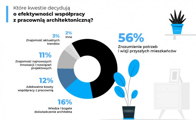 Jak wynika z raportu Homebook.pl, najistotniejszą kwestią, decydującą o sukcesie i efektywności współpracy z pracownią, jest zrozumienie wizji przyszłych mieszkańców. Kluczowe znaczenie dla inwestorów ma stworzenie projektu odpowiadającego w pełni na potrzeby – ich zrozumienie ma największe znaczenie dla 56% ankietowanych. W drugiej kolejności respondenci wskazywali aspekt związany z doświadczeniem i wiedzą ekspercką architekta lub architektki (16%). Nieco mniej istotnym czynnikiem, decydującym o pozytywnej ocenie współpracy z pracownią są kwestie finansowe – adekwatne koszty usług mają znaczenie dla 12% osób. W ostatniej kolejności użytkownicy Homebook.pl wymieniali dominującą rolę wiedzy architekta z zakresu innowacji i skutecznych rozwiązań projektowych (11%) oraz znajomość aktualnych trendów (3%).