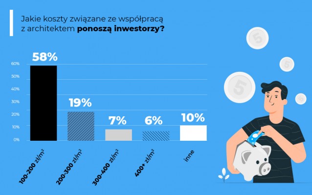 Osoby, które mają doświadczenie we współpracy z pracownią, zapytani o wysokość kosztów związanych z zakupem projektu, najczęściej wskazywali na zakres 100-200 zł/m2 (58% osób). Blisko 20% ankietowanych zadeklarowało kwotę w przedziale 200-300 zł/m2, a 7% z nich – 300-400 zł/m2. Nieco mniej liczna część respondentów (6%) na zakup projektu swojego wnętrza przeznaczyła kwotę wyższą niż 400 zł/m2. Pozostała grupa uczestników badania 10%) zaznaczyła opcję „inne”.