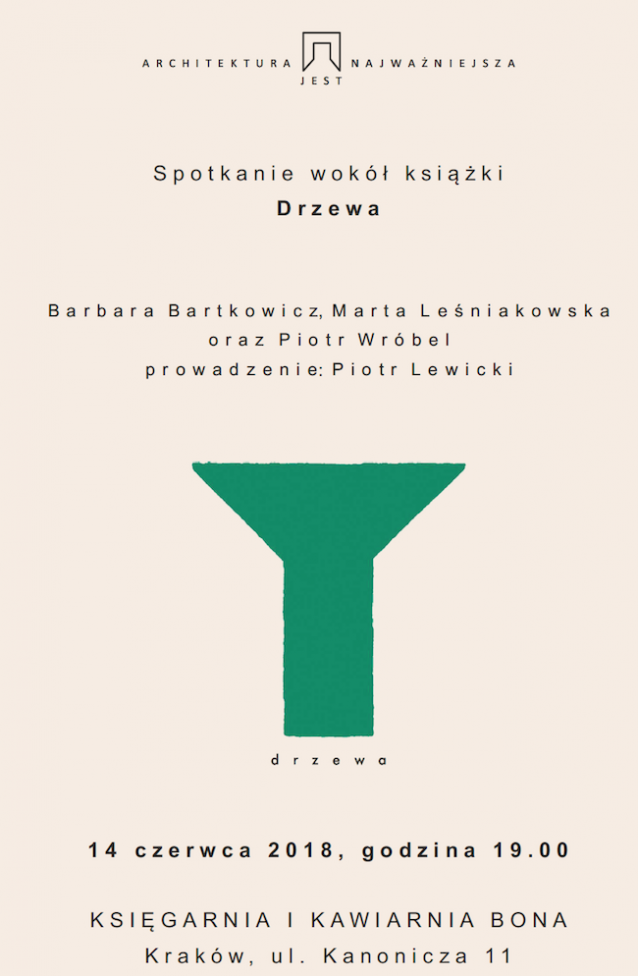 Zapraszamy na spotkanie wokół książki "Drzewa" z serii "Architektura jest najważniejsza". Spotkanie odbędzie się 14 czerwca o godzinie 19.00 w księgarni i kawiarni Bona przy ulicy Kanoniczej 11 w Krakowie. Poprowadzi je Piotr Lewicki, a rozmawiać o książce będą jej autorzy: Barbara Bartkowicz, Marta Leśniakowska i Piotr Wróbel.