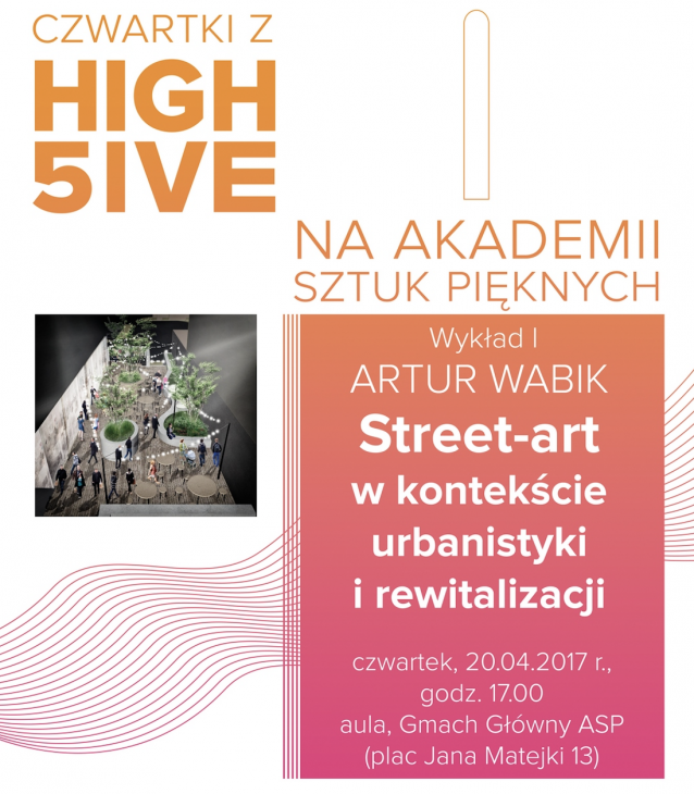 Pięć otwartych wykładów, obejmujących m.in. street art, projektowanie przestrzeni, socjologię miasta czy współpracę między architekturą i sztuką – tak zapowiada się cykl „Czwartki z High5ive”, realizowany na Akademii Sztuk Pięknych w Krakowie.