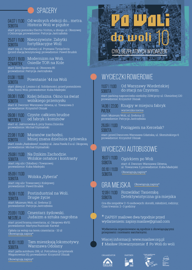 To już dziesiąte lato, kiedy mieszkańcy i miłośnicy Woli mają okazję uczestniczyć w serii spacerów po dzielnicy. W jubileuszowym programie „Po Woli do woli” znalazło się osiemnaście wydarzeń: spacerów, wycieczek rowerowych i autobusowych oraz gra miejska. Uczestnicy odwiedzą wolską „Syberię” czy tamtejszy Dziki Zachód, poznają nieodkryte zakątki cmentarza żydowskiego, zajrzą w postindustrialne zakątki dzielnicy i sprawdzą, ile dawnych fabryk to dziś popularne miejsca wieczornego rekaksu. Część programu to także wycieczki związane z transportem i jego wolską historią – w tym roku obchodzimy 175 - lecie kolei Drogi Żelaznej Warszawsko - Wiedeńskiej oraz 145 - lecie kolei obwodowej. W programie m. in. spacer na Odolany poświęcony kolei czy przejażdżka rowerowa szlakiem niezrealizowanej trasy kolejowej przez... Kercelak. Do tego poszukiwania modernistycznych budynków na Woli czy przemierzanie jej szlakiem fortyfikacji Twierdzy Warszawa.