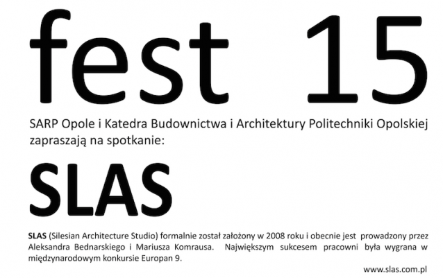 Stowarzyszenie Architektów Polskich o/Opole we współpracy z Katedrą Budownictwa i Architektury Politechniki Opolskiej zaprasza na spotkanie z cyklu: “FEST”,, którego gościem będą architekci Aleksander Bednarski i Mariusz Komraus.