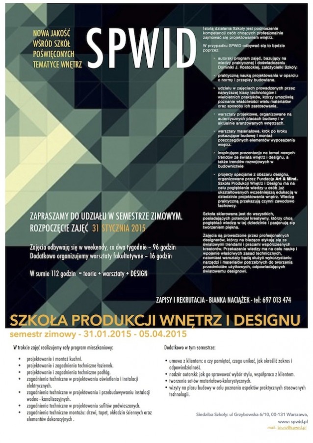 Już 31 stycznia 2015 roku rusza Semestr Zimowy w Szkole Produkcji Wnętrz i Designu. Mentor Szkoły – Dominika J. Rostocka – gwarantuje wysoką jakość merytoryczną autorskiego programu, który ma rozwijać kreatywność, wprowadzać świeże spojrzenie w projektowane wnętrza, jednocześnie dotrzymując kroku światowym trendom.