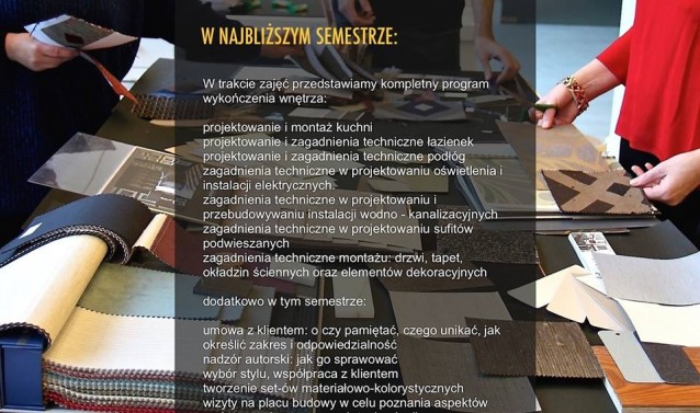 Własne doświadczenie podpiera ona wiedzą najwyższej klasy specjalistów, z którymi współpracuje przy tworzeniu wnętrz. W trakcie semestru odbędą się również zajęcia umożliwiające poznanie nowoczesnych materiałów, takich jak: beton architektoniczny, corian, skóra naturalna i wiele innych.
