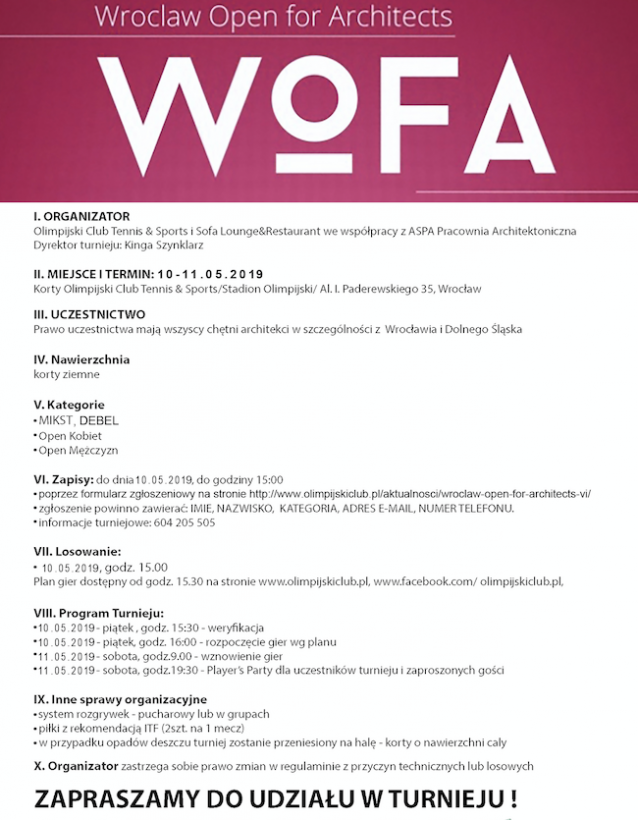 Zapraszamy na VI edycję turnieju tenisowego dla architektów Wroclaw Open for Architects WOFA organizowanych w dniach 10-11 maja na kortach Stadionu Olimpijskiego al. I. Paderewskiego 35 we Wrocławiu.