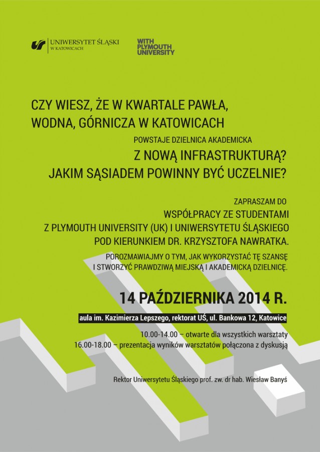 Do 16 października 2014 roku Uniwersytet Śląski w Katowicach będzie gościć grupę dwudziestu studentów pod opieką dr. Krzysztofa Nawratka z School of Architecture, Design and Environment Faculty of Arts Plymouth University (Wielka Brytania). W trakcie wizyty goście z grupą studentów z Uniwersytetu Śląskiego będą w ramach warsztatów omawiać temat Dzielnicy Akademickiej, która ma powstać w Katowicach w kwartale ulic: Pawła, Wodna, Górnicza. Wizyta jest początkiem współpracy między Uniwersytetem Śląskim a Plymouth University.