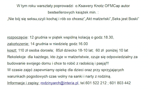 Informacja i zapisy do końca miesiąca: rodzinyarch@interia.pl.