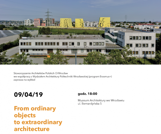 Stowarzyszenie Architektów Polskich O/Wrocław we współpracy z Wydziałem Architektury Politechniki Wrocławskiej (program Erasmus+) zaprasza na wykład FROM ORDINARY OBJECTS TO EXTRAORDINARY ARCHITECTURE prof. arch. Iván Capdevila Castellanos Uniwersytet w Alicante, Hiszpania współzałożyciel PLAYstudiolider projektu edukacyjnego More Than Green