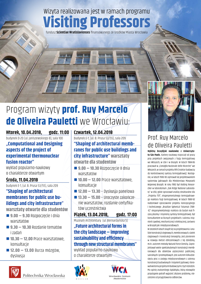 W dniach 10.04 do 13.04 2018 na Politechnice Wrocławskiej będzie gościł prof. Ruy Marcelo de Oliveira Pauletti, wybitny brazylijski naukowiec z Uniwersytetu São Paulo. W programie między innymi 13.04.2018 piątek, 17.00 – 19.00 wykład otwarty o charakterze popularno-naukowym: „Future architectural forms in the city landscape – improving sustainability and efficiency through new structural membranes” – Muzeum Architektury, Wrocław, ul. Bernardyńska 5.