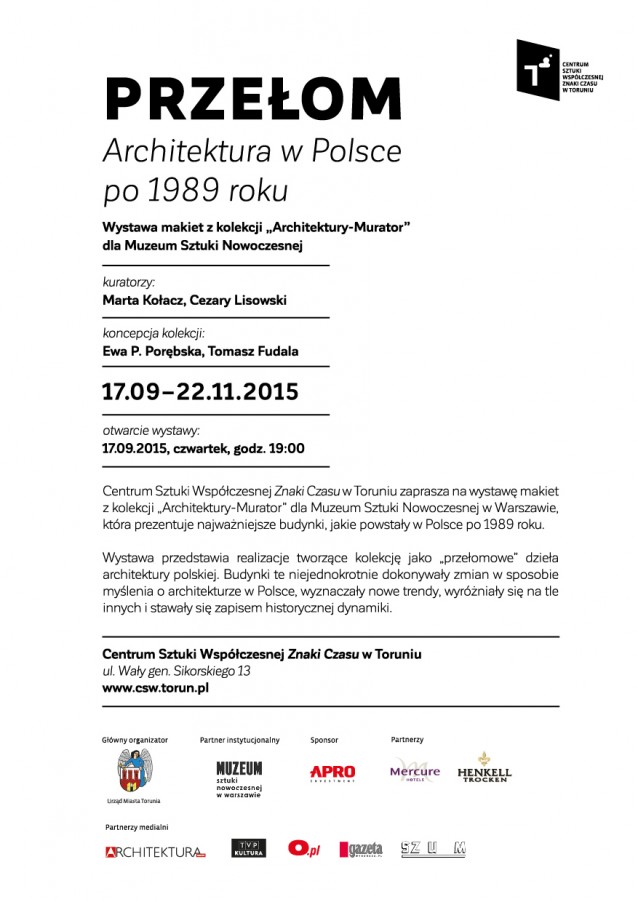 Od 17 września do 22 listopada w Centrum Sztuki Współczesnej Znaki Czasu w Toruniu odbędzie się wystawa „PRZEŁOM. Architektura w Polsce po 1989 roku”. Zaprezentowana zostanie na niej unikatowa kolekcja makiet współczesnej polskiej architektury, przygotowana z okazji XX-lecia miesięcznika „ARCHITEKTURA-murator” dla Muzeum Sztuki Nowoczesnej w Warszawie.