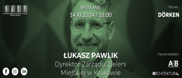 Stowarzyszenie Architektów Polskich Oddział Kraków serdecznie zaprasza w czwartek, 14 listopada 2024, o godzinie 18.00do Galerii Architektury SARP Oddział Kraków przy placu Szczepańskim 6 na spotkanie „Przyszłość Terenów Zieleni w Krakowie”, z udziałem pana Łukasza Pawlika, Dyrektora Zarządu Zieleni Miejskiej w Krakowie.