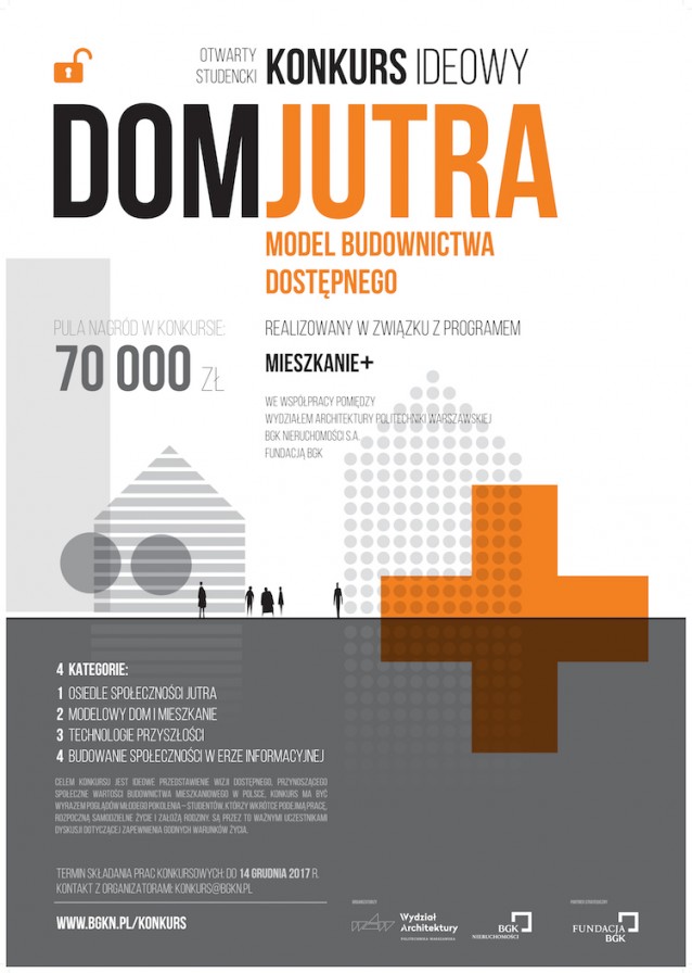 Zapraszamy do udziału w otwartym konkursie „Dom jutra. Model budownictwa dostępnego”, skierowanym do studentów i absolwentów polskich uczelni, organizowany przez BGK Nieruchomości S.A. i Wydział Architektury Politechniki Warszawskiej.