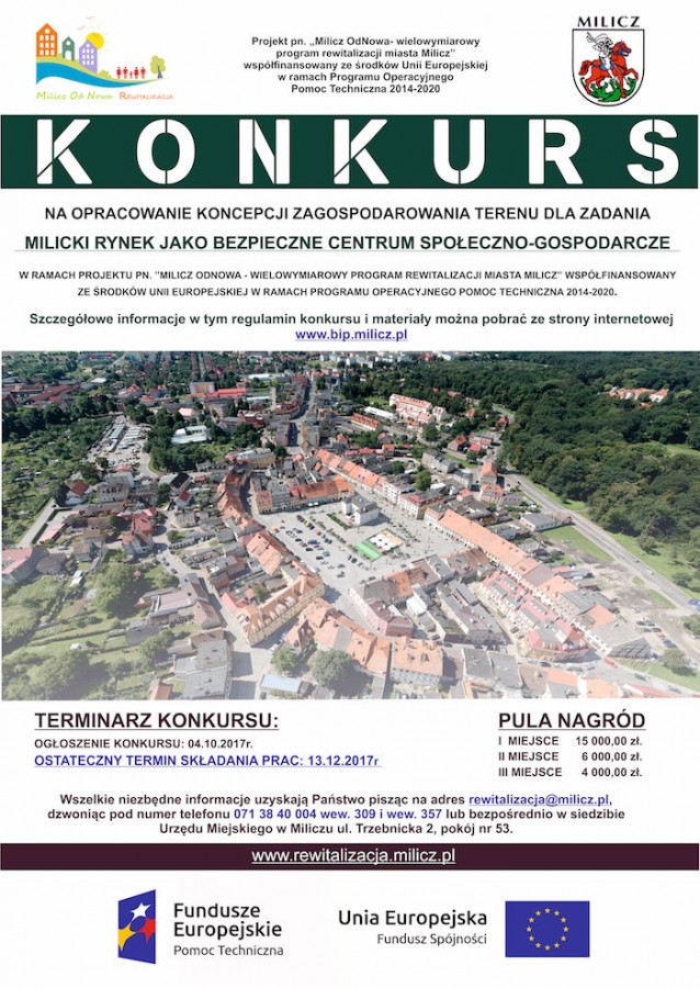Uwaga projektanci ! Zmiana ostatecznego terminu składania prac na 13.12.2017 oraz możliwość składania prac w formacie 70x100 w konkursie na opracowanie koncepcji zagospodarowania terenu przestrzeni publicznej dla zadania MILICKI RYNEK JAKO BEZPIECZNE CENTRUM SPOŁECZNO-GOSPODARCZE w ramach projektu pn. ”Milicz OdNowa – wielowymiarowy program rewitalizacji miasta Milicz” współfinansowany ze środków Unii Europejskiej w ramach Programu Operacyjnego Pomoc Techniczna 2014-2020.
