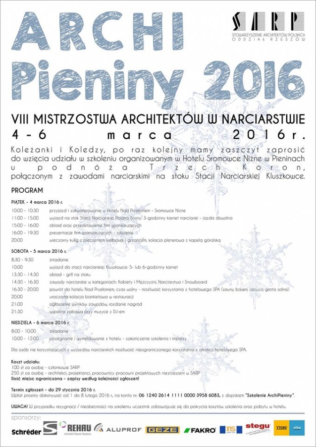 W załączeniu (drugi obrazek) informacje szczegółowe dotyczące WYJAZDU SZKOLENIOWEGO ARCHIPIENINY 2016 połączonego z VIII Mistrzostwami Architektów w narciarstwie. Tegoroczna edycja odbędzie się w Pieninach, w uroczym hotelu "Nad Przełomem" zlokalizowanym u podnóża Trzech Koron.