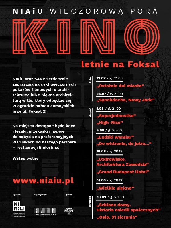 Stowarzyszenie Architektów Polskich oraz Narodowy Instytut Architektury i Urbanistyki zapraszają na pokazy filmów w ramach kina letniego. Repertuar obejmuje tytuły szeroko związane z architekturą.